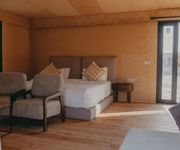 After your camel ride, enjoy a delightful Moroccan lunch served under a cozy Bedouin-style tent. Savor traditional dishes, including tagines, fresh salads, and sweet Moroccan treats, accompanied by mineral water. This is also a wonderful opportunity to mingle with local hosts and soak in the peaceful ambiance of the desert.